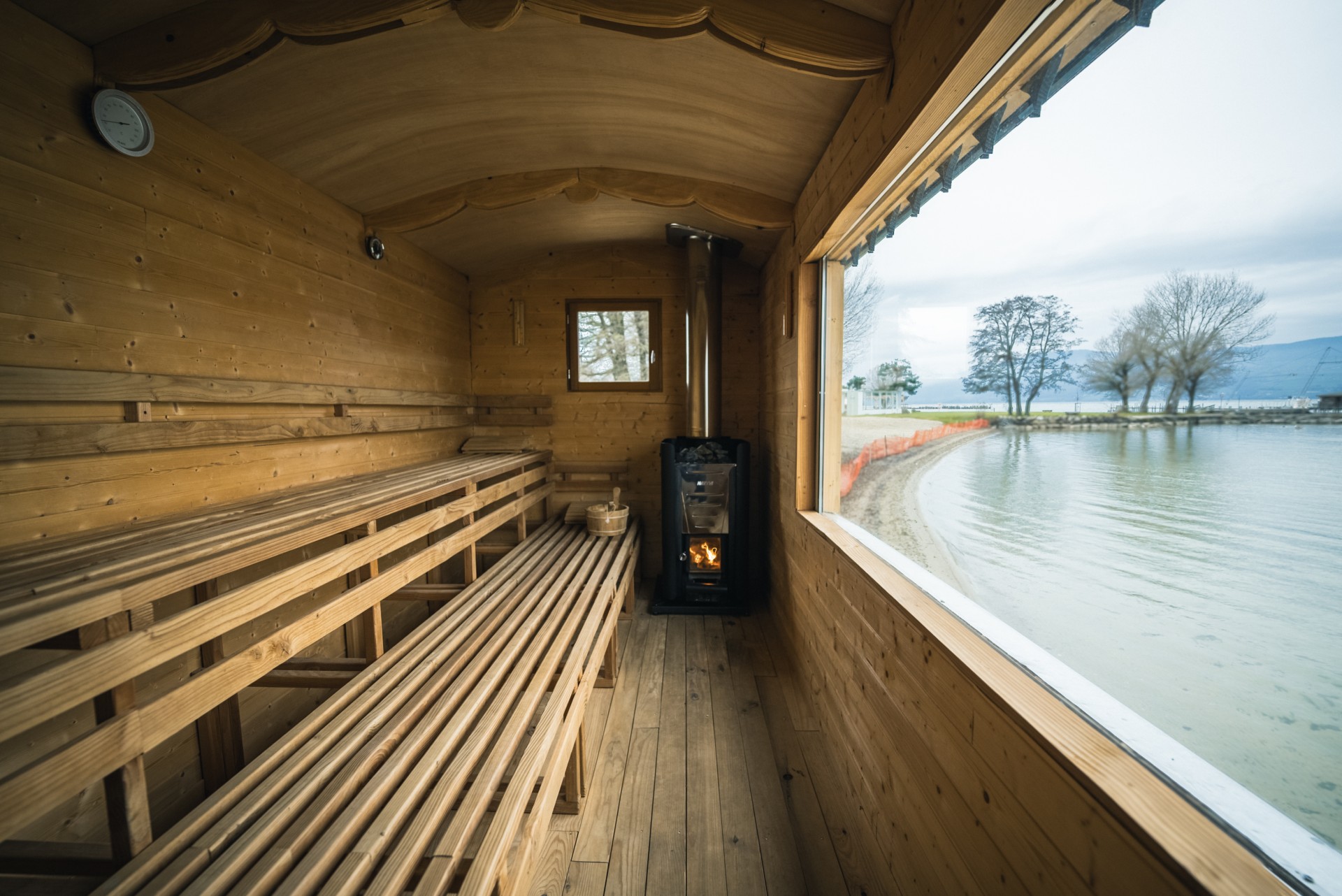 Eingebettet an den malerischen Ufern des Neuenburgersees bietet dieses kurzlebige Refugium einen entspannenden Rückzugsort. Besucher entdecken hier einen sorgfältig ausgearbeiteten Entspannungspfad, der die belebende Wirkung der Sauna, die wohltuende Wärme des Wohnwagens und die belebende Erfahrung der Kryotherapie im kalten Wasser miteinander verbindet.