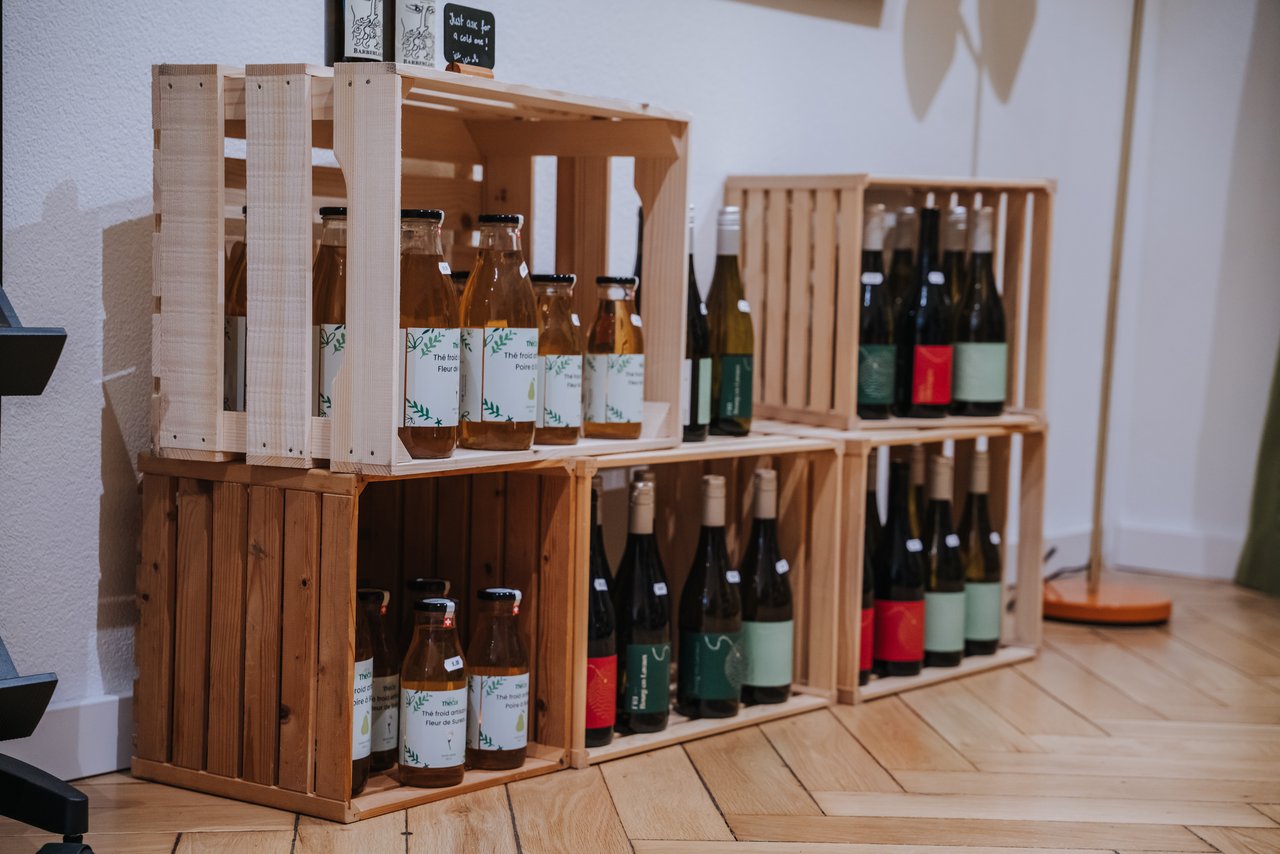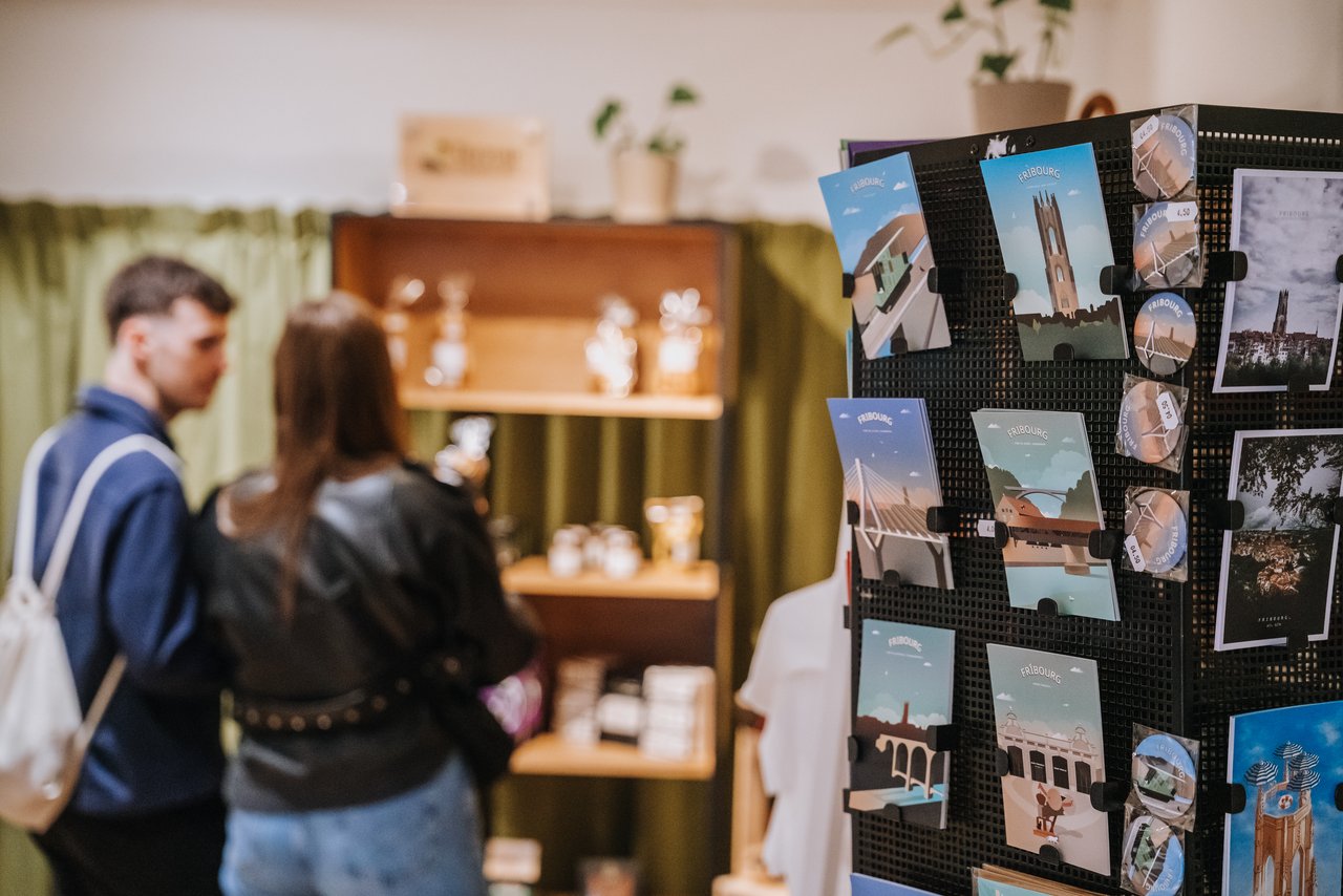 Dort finden Sie verschiedene Publikationen von Freiburger Künstlern, darunter Postkarten von Ludo Hartmann, Buksy, Ludo Déglise und der Association Ste-Camille, sowie Lioba-Kräutertees, Wein von der Domaine de la Bourgeoisie, Freiburger Senf, Thécol-Eistees, Pasta von Prameya und viele weitere Köstlichkeiten.