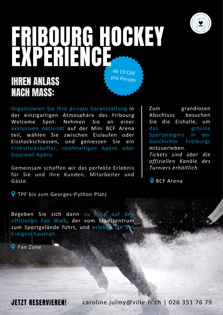 Bieten Sie Ihren Partnern oder Mitarbeitenden ein einzigartiges Hockey-Erlebnis im Fribourg Welcome Spot: Frühstück oder Apéro, Unterhaltung sowie Aktivitäten in der Mini BCF Arena. Erleben Sie die WM 2026 im Herzen der Stadt Freiburg und hinterlassen Sie einen bleibenden Eindruck!