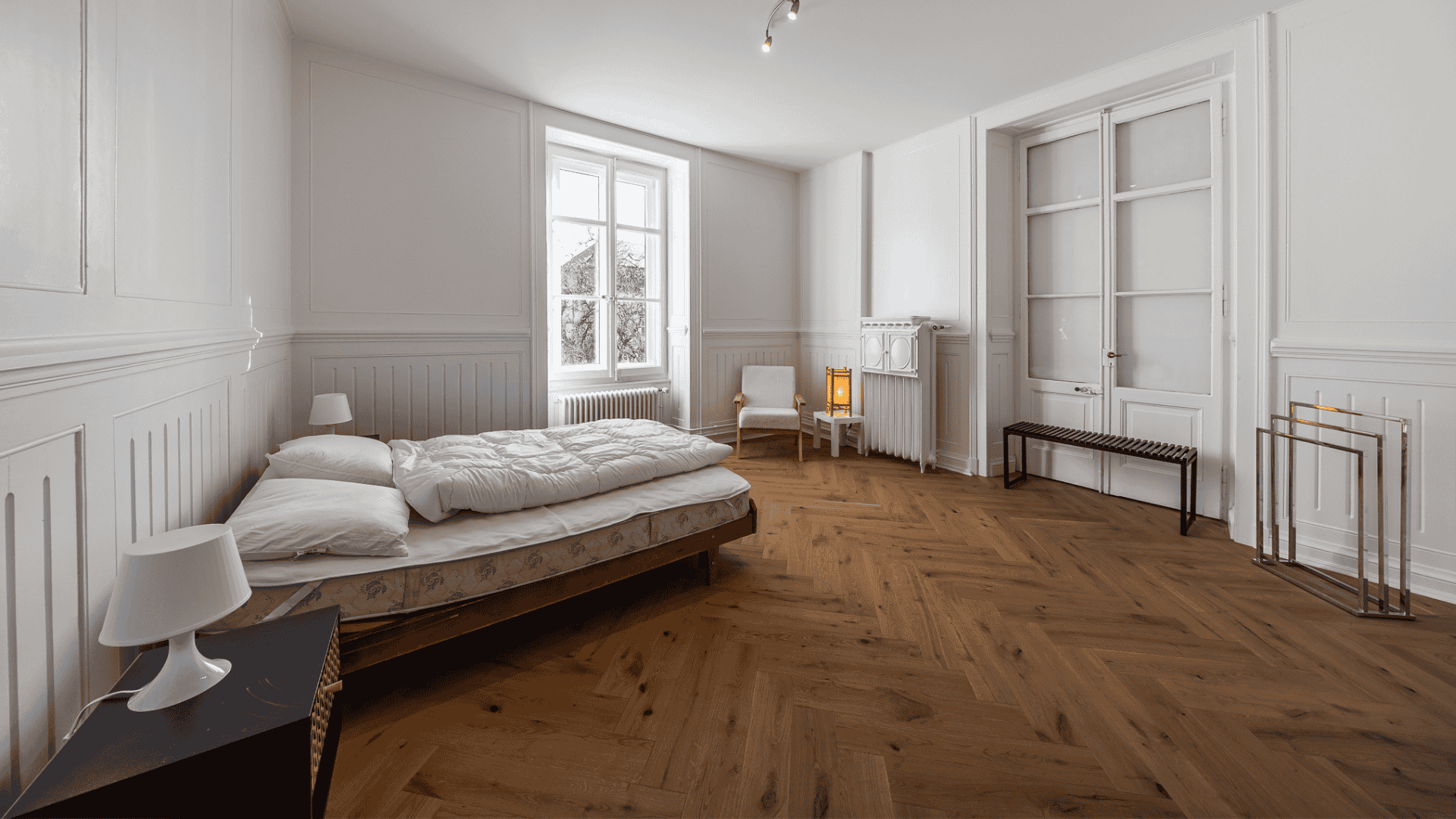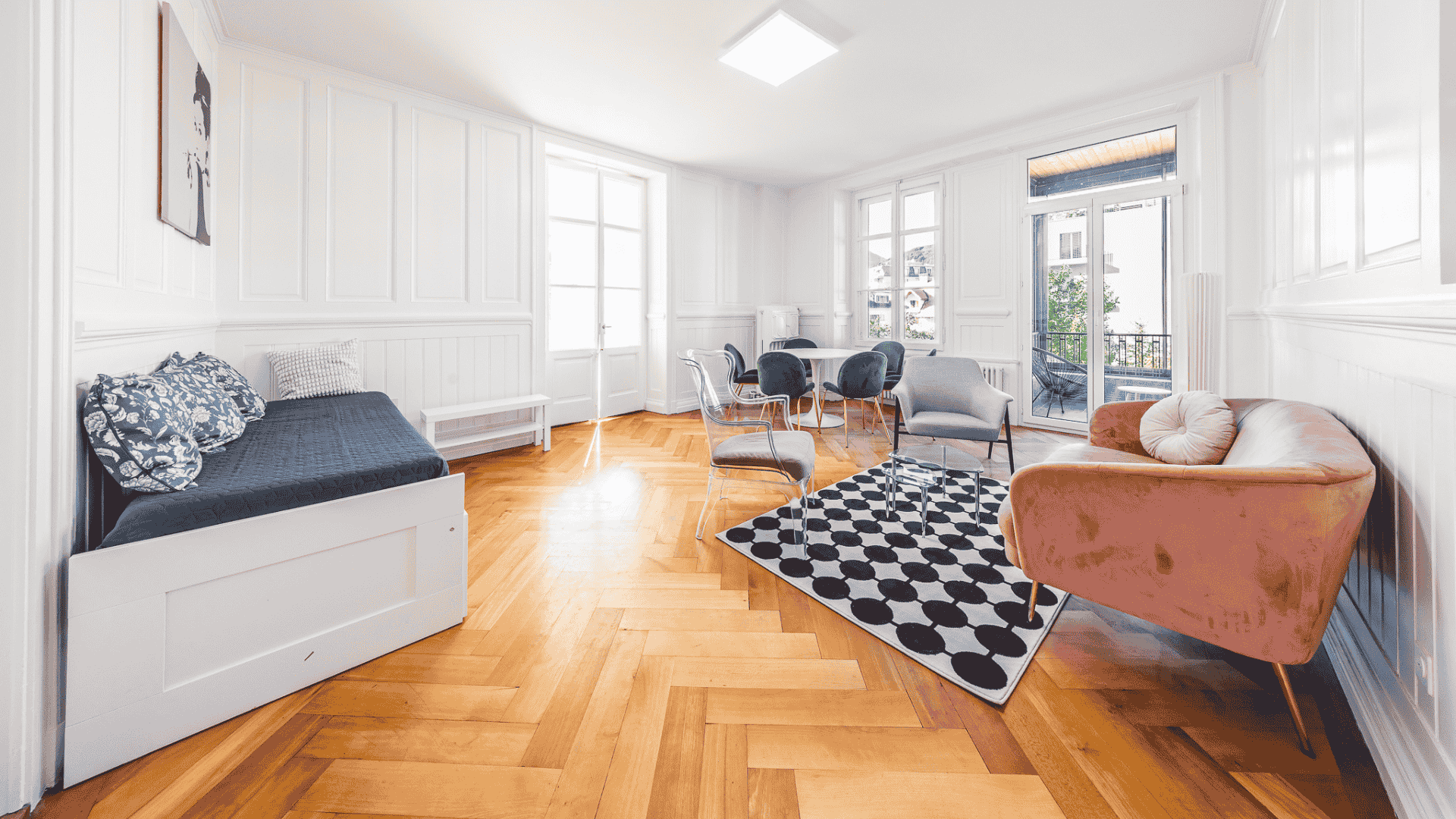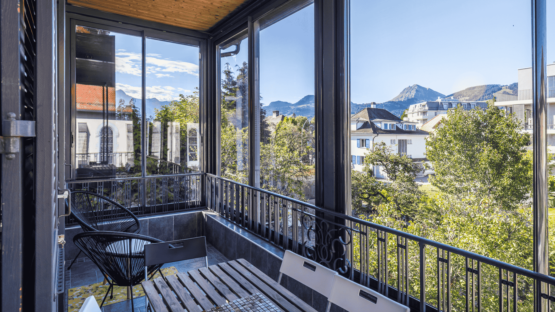 Komfort in Bulle in einer renovierten Wohnung mit Charme und hohen Decken, nur wenige Gehminuten vom Zentrum entfernt. Wintergarten. Ein Parkplatz. Kann monatlich gemietet werden.