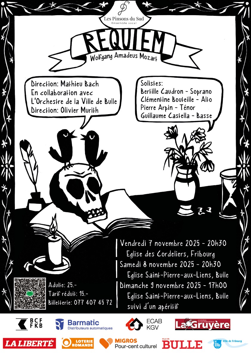 Um das 10-jährige Bestehen des Chores „Les Pinsons du Sud” gebührend zu feiern, haben Sie beschlossen, das Requiem von W.A. Mozart (KV 626) aufzuführen. Bei dieser Konzertreihe mit drei Konzerten werden Sie vom Orchestre de la ville de Bulle (Dirigent: Olivier Murith) sowie den Solisten Bertille Caudron (Sopran), Clémentine Bouteille (Alt), Pierre Arpin (Tenor) und Guillaume Castella (Bass) begleitet. |