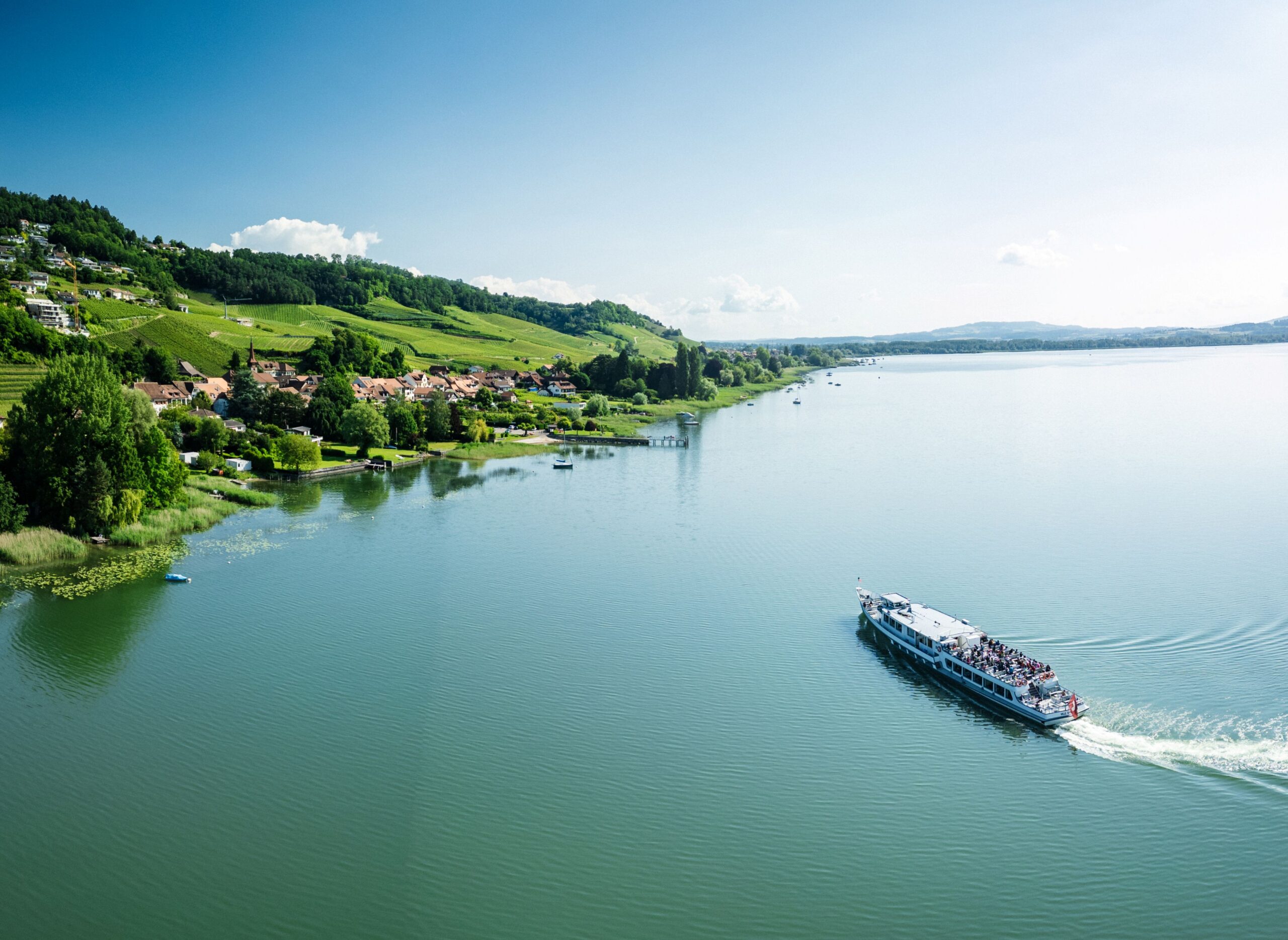 Die 2-Seen-Schifffahrt verbindet den Murtensee mit dem Neuenburgersee und bietet eine entspannte Reise durch das Drei-Seen-Land.