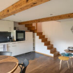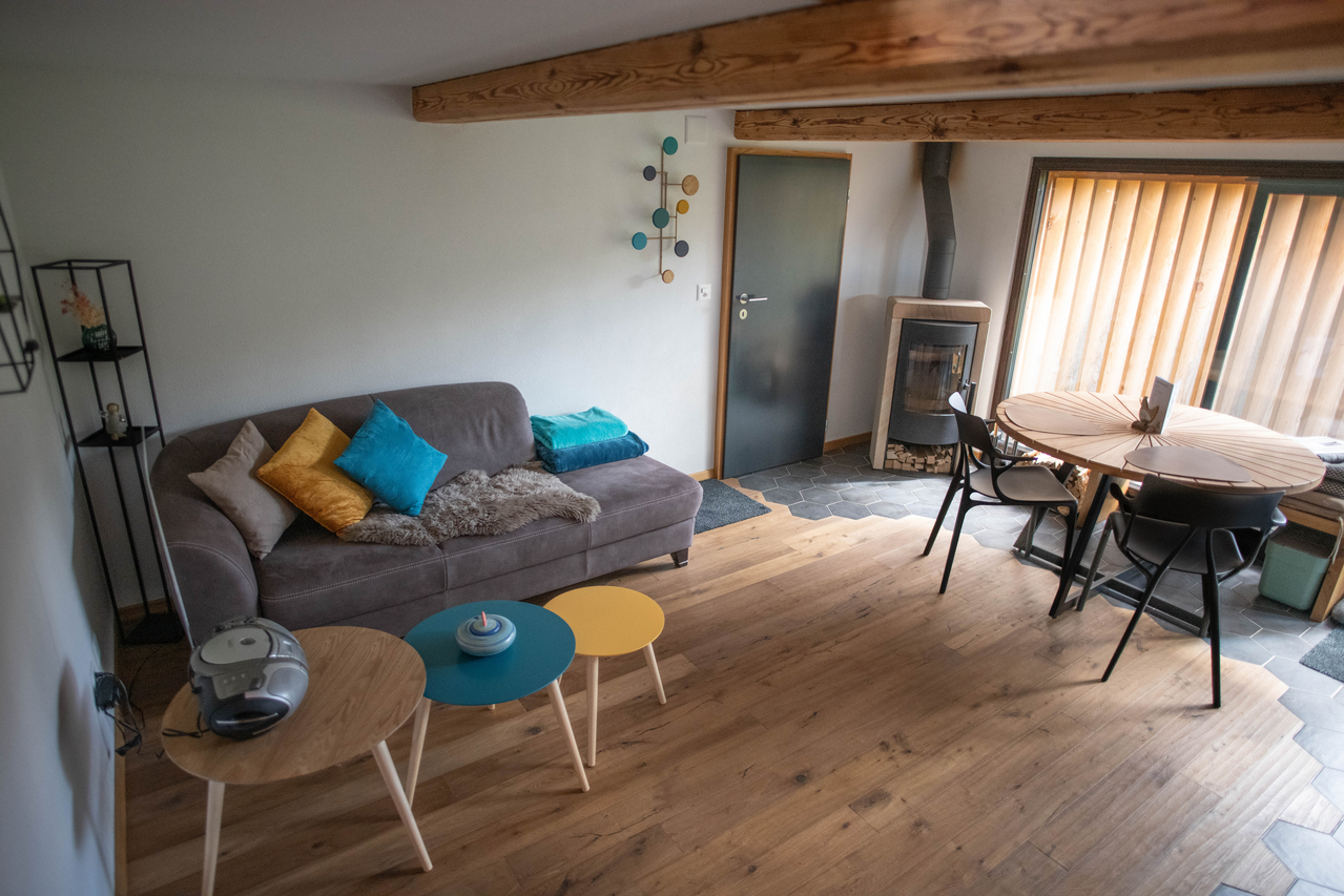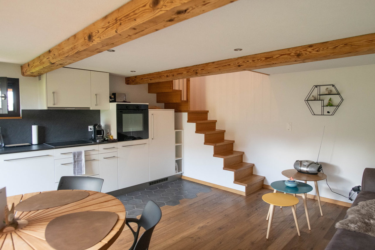 Im Erdgeschoss finden Sie einen Wohnbereich mit Sofa, Esstisch und Küche sowie eine separate kleine Toilette. E