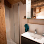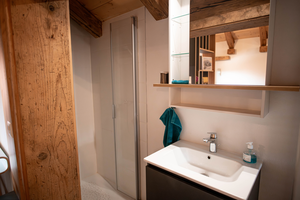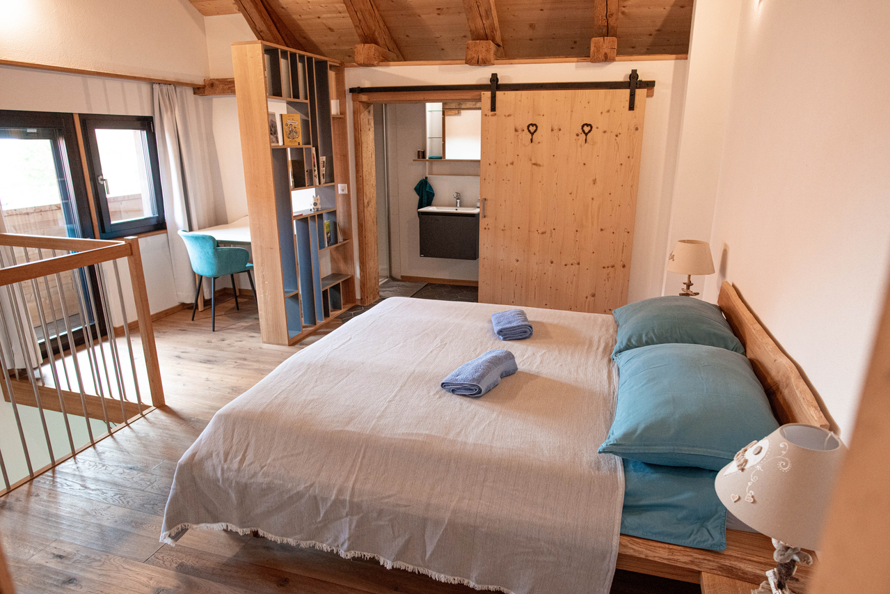 ine kleine Treppe führt Sie in den ersten Stock, wo Sie ein schönes Schlafzimmer mit Arbeitsbereich und ein Badezimmer mit Dusche, Waschbecken und WC vorfinden.