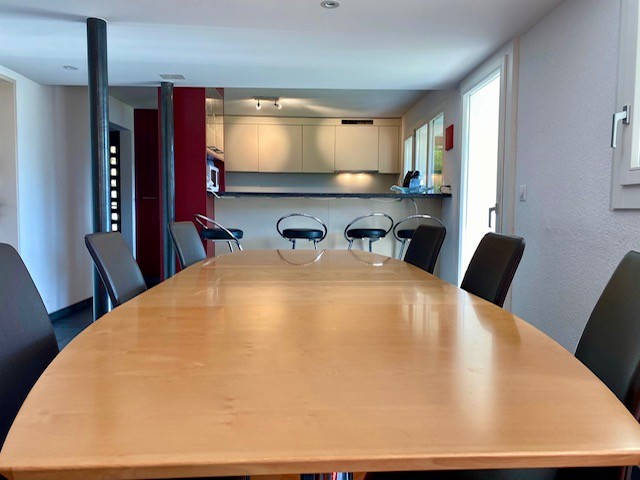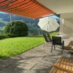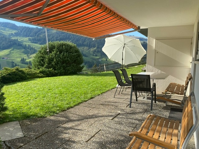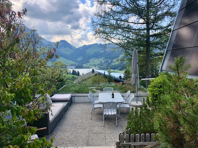 Die sonnige Terrasse lädt mit Sitzgarnitur, Tisch und Sonnenschirm zum Verweilen ein. Ein Cheminée bietet die Möglichkeit zum Grillieren, während Sie vom Sitzplatz aus einen herrlichen Blick auf den Schwarzsee und den Schwyberg geniessen. Ein Garten ergänzt das Angebot und schafft zusätzlichen Raum zum Entspannen.