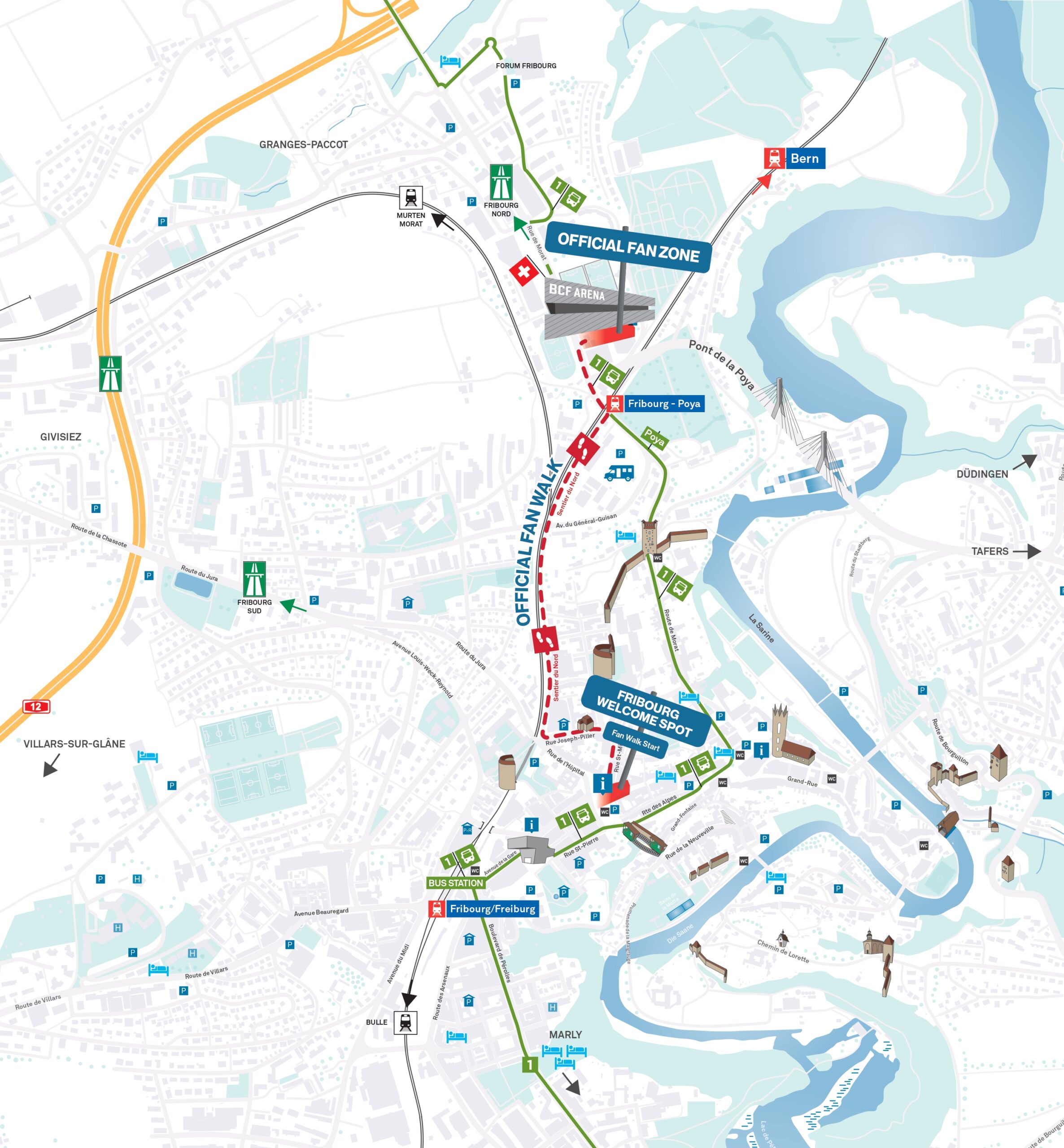 Con il tuo biglietto della partita potrai viaggiare gratuitamente sui mezzi pubblici in tutto il cantone di Friburgo il giorno della partita (vedi mappa delle zone). Approfittane per raggiungere la BCF Arena e per scoprire la regione di Friburgo!