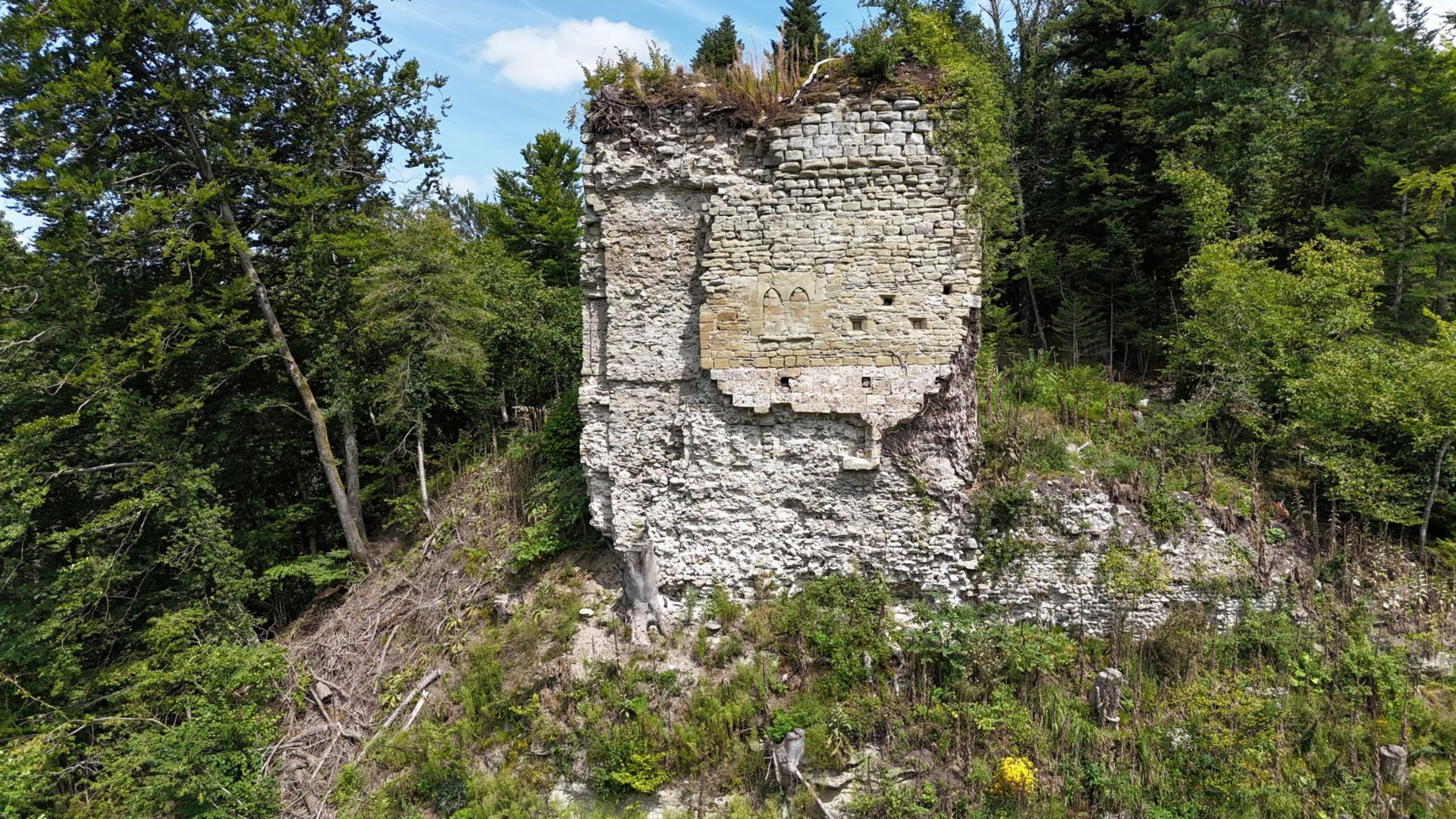 Since its abandonment in the mid-15th century, when it was already in a dilapidated state, the site has been used as a quarry for various churches and buildings in Fribourg. The natural erosion of the molasse cliffs on either side of the spur has undoubtedly washed away part of the facades of the two rows of houses on the void side. Vegetation, particularly trees — mostly spruce, beech, and pine — has grown up, causing inherent damage through root growth.