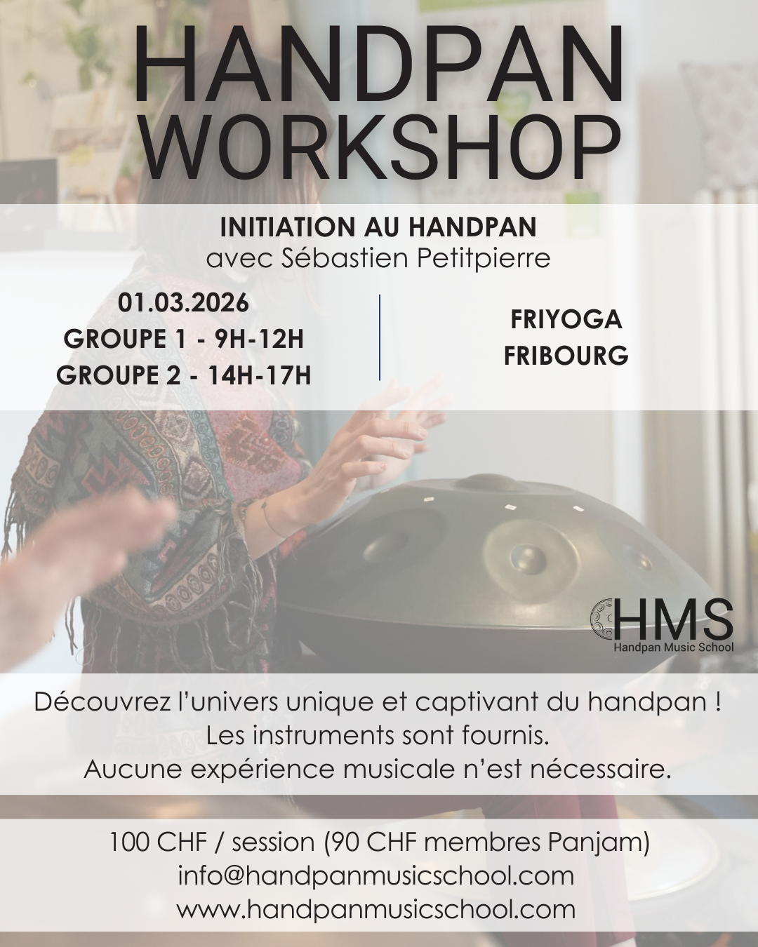 Handpan initiation workshops are open to everyone and are designed to explore the instrument in a playful and sensory way, through hands-on discovery, learning basic techniques, rhythmic and melodic playing, and first experiences of improvisation, with no musical background required.