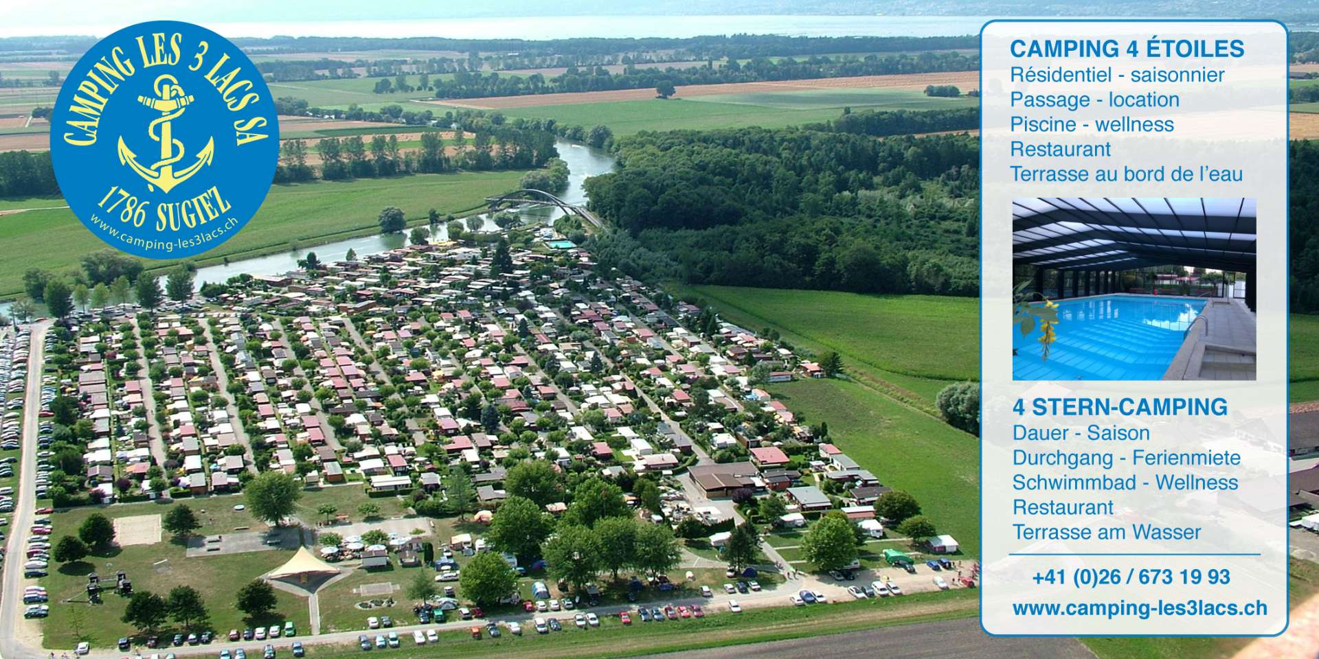 Ideally situated between the lakes of Murten, Neuchâtel and Bienne, Camping Les 3 Lacs, on the banks of the Broye Canal, offers an idyllic green setting for your holidays and excursions, on foot, by bike or by boat.