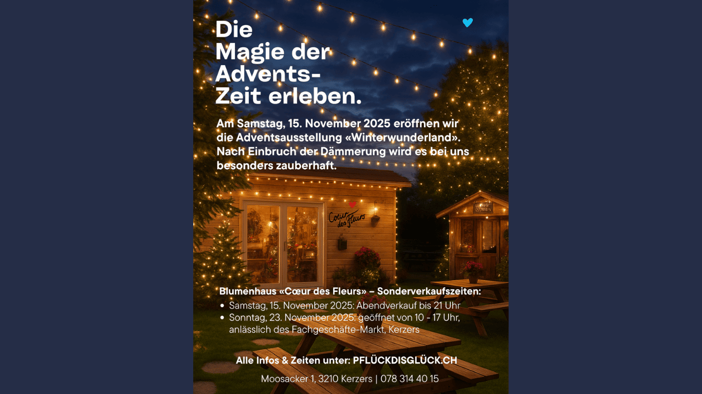 Be enchanted by our Advent exhibition at "Pflück dis Glück"! Wonderful creations from our flower shop and a festive atmosphere invite you to enjoy, marvel and linger!