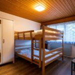 The apartment has an open kitchen with dining table and living room, which even has a fireplace. Next to the living room is the large bedroom with a double bunk bed. A baby bed is also available.