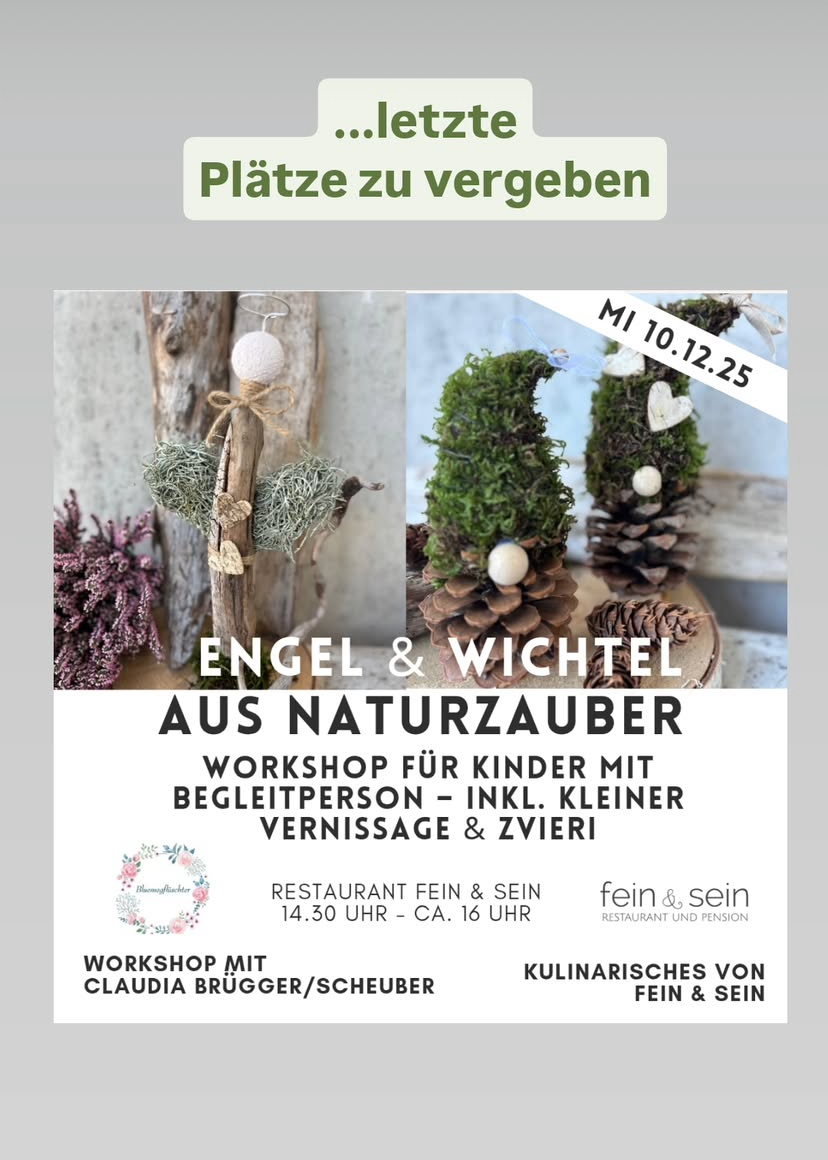 Bring your mum, dad, godmother or godfather along and get creative together! Using natural materials, paints and a little glitter, you can design your very own angel or elf. Unique, imaginative and made with love. The course is led by Claudia, owner of Bluemegflüschter. At the end, we will celebrate with a small vernissage where your works of art can shine. And of course, a delicious afternoon snack will be waiting for you.