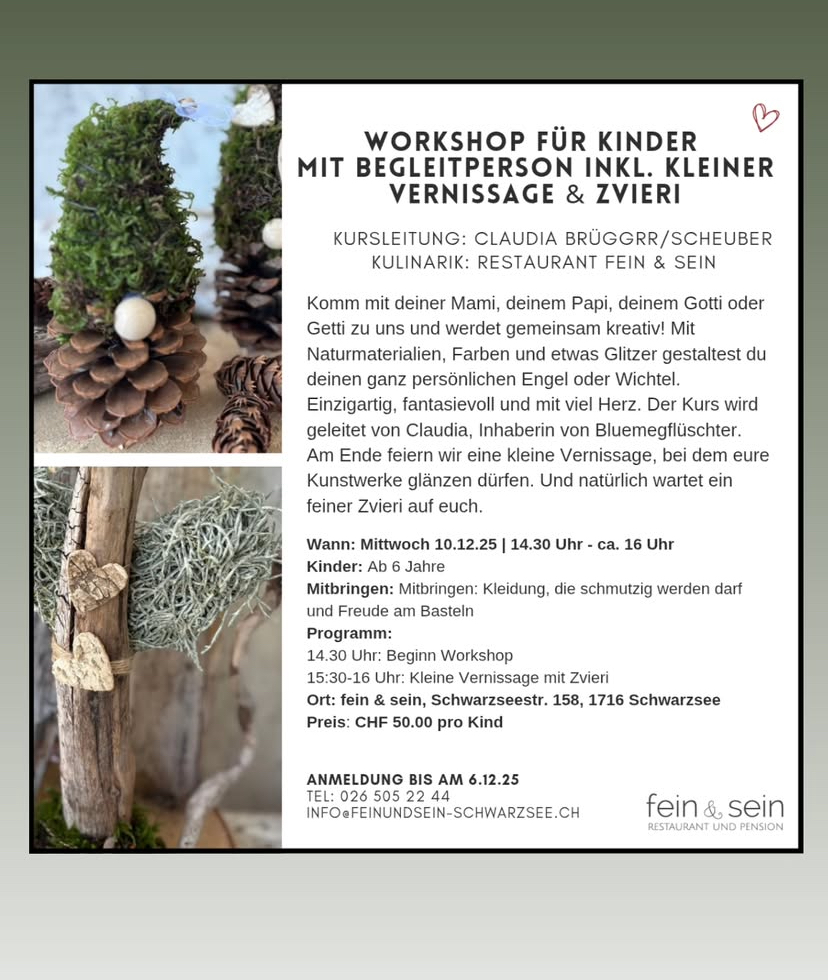 - RESERVATION required by 3 December 2025: info@feinundsein-schwarzsee.ch or 026 505 22 44