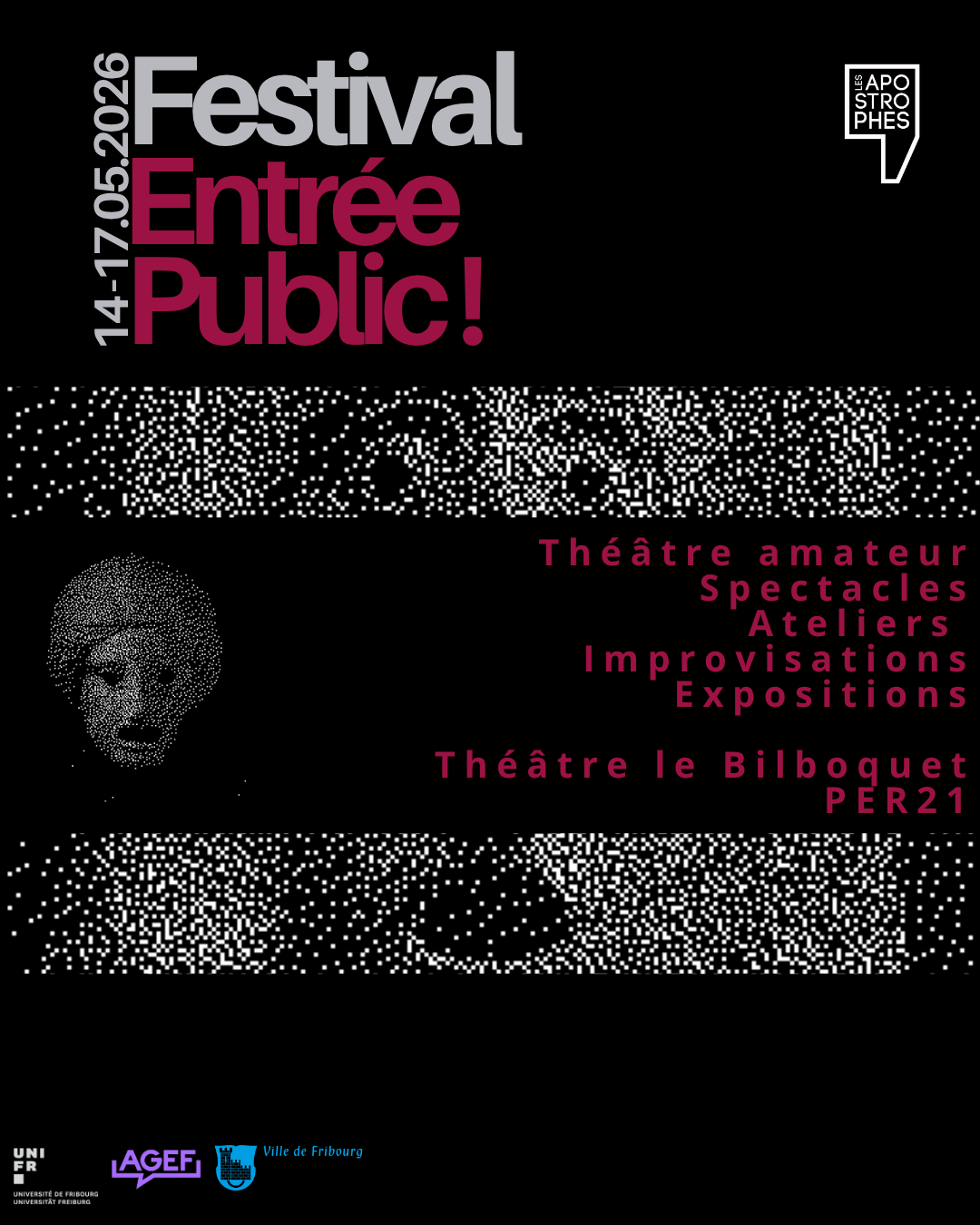 Entrée Public! est un festival de théâtre amateur durant lequel plusieurs troupes romandes et fribourgeoises, notamment la troupe de l'Université de Fribourg, présentent leurs projets. Il se déroule du 14 au 17 mai et est ouvert à tous les amateurs de théâtre ou curieux intéressés par le 6ème art !
