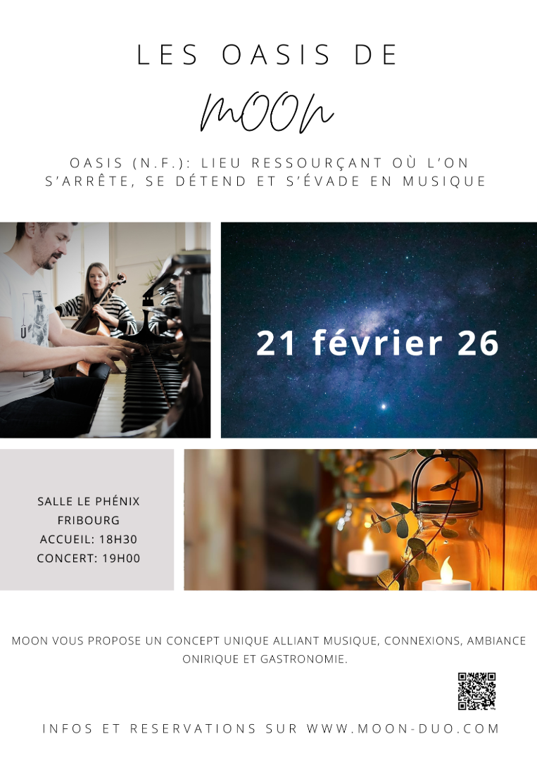 - Une musique envoûtante du duo fribourgeois MOON (piano violoncelle électro acoustique) - avec des morceaux spécialement composés ou adaptés pour cet événement, en collaboration avec Sébastien Littlestone au handpan.