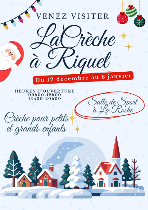 Comme chaque année, retrouvez la grande crèche artisanale à Riquet du 12 décembre au 6 janvier à la salle de sport de La Roche.