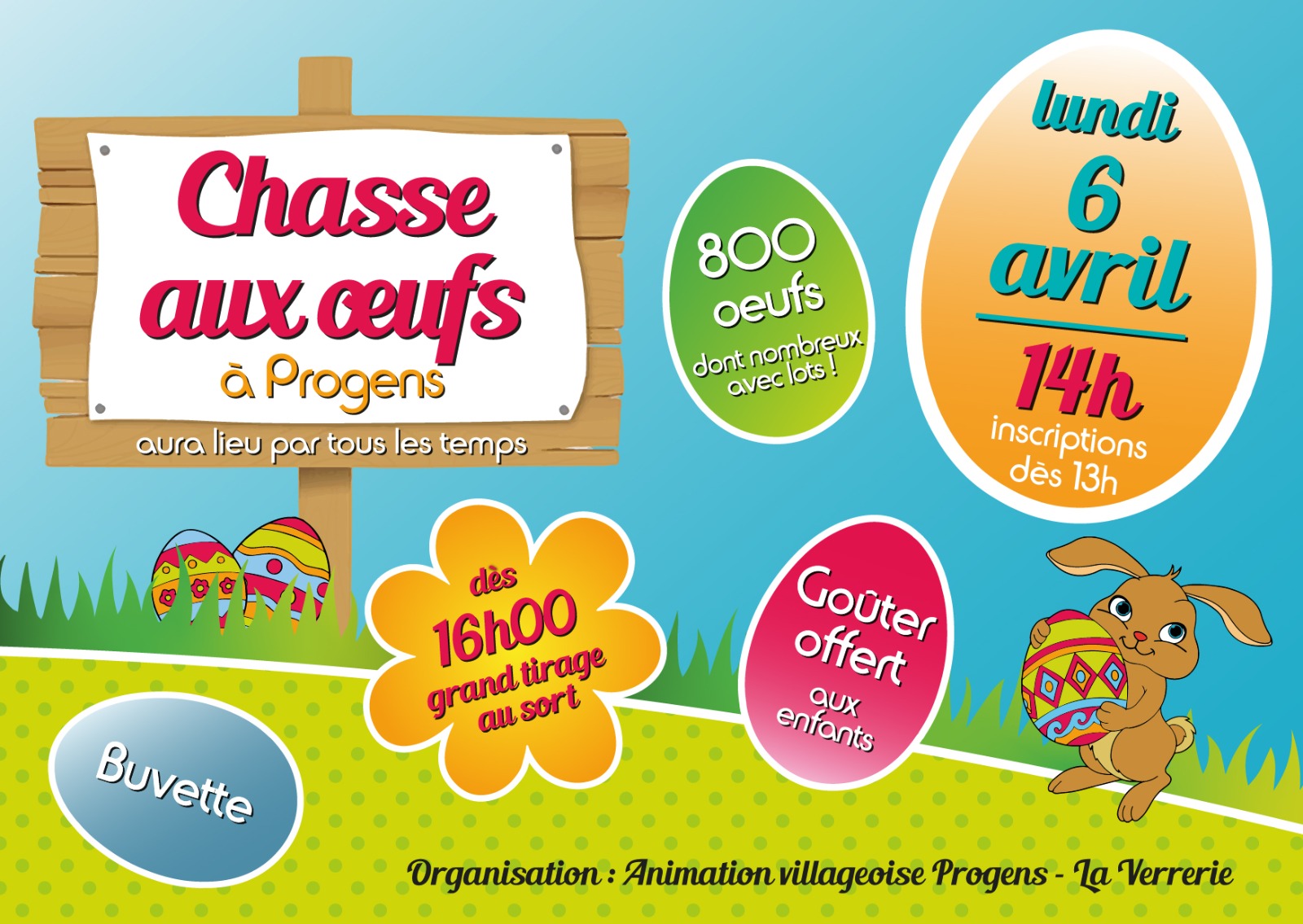 Chasse aux oeufs pour enfants en forêt (venez équipés en circonstance), inscriptions dès 13h00 et départ de la chasse à 14h00.