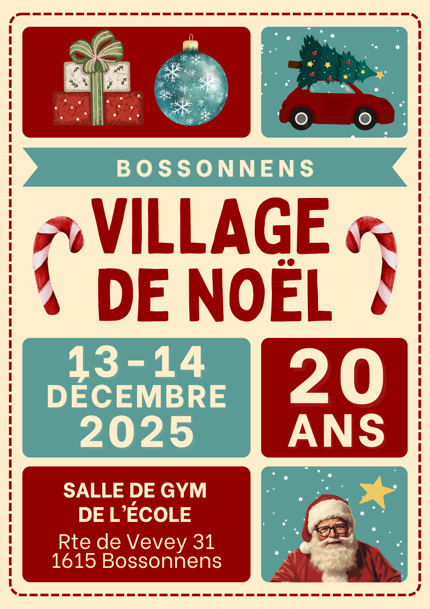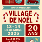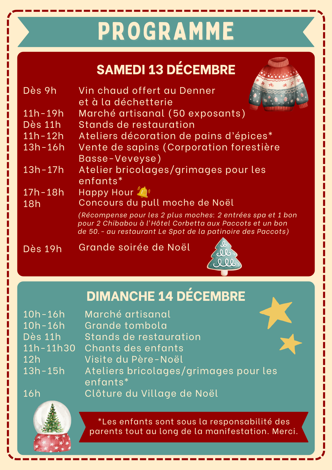 Comme à l'accoutumée, le Village de Noël se tiendra à l'intérieur bien au chaud, vous présentant plus de 40 exposants. Animations pour petits et grands, mini disco de Noël, ateliers créatifs, grimages, vente de sapins de Noël, tombola seront organisés sans oublier la visite du Père Noël. Restauration chaude et froide et bar.