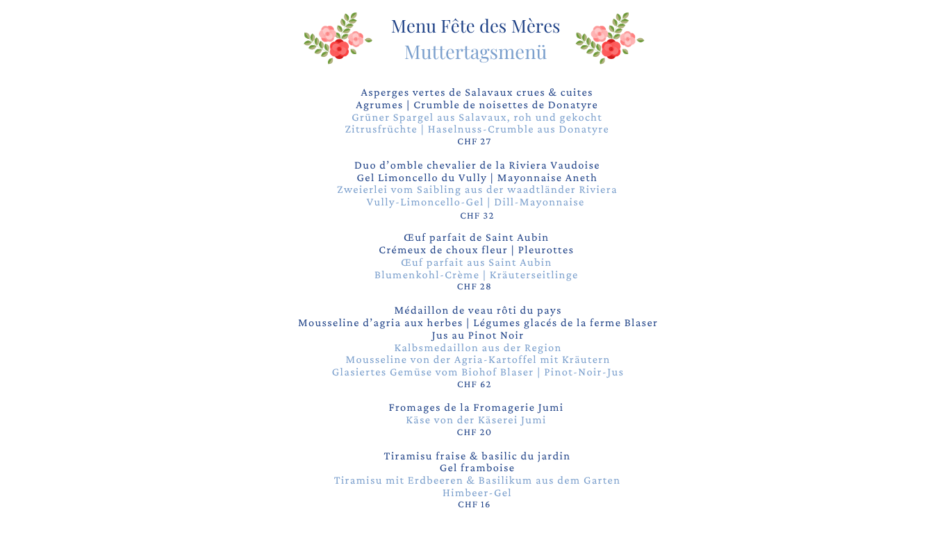 votre grand-mère ou votre arrière-grand-mère un moment de plaisir exceptionnel. Notre menu de la fête des Mères, conçu avec soin, allie ingrédients de saison, compositions raffinées et finesse culinaire, le tout accompagné par notre équipe de service attentive et chaleureuse, qui saura gâter votre mère, votre grand-mère et vos autres invités.
