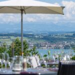 Magnifique terrasse avec vue panoramique sur le lac de Morat et les Alpes.