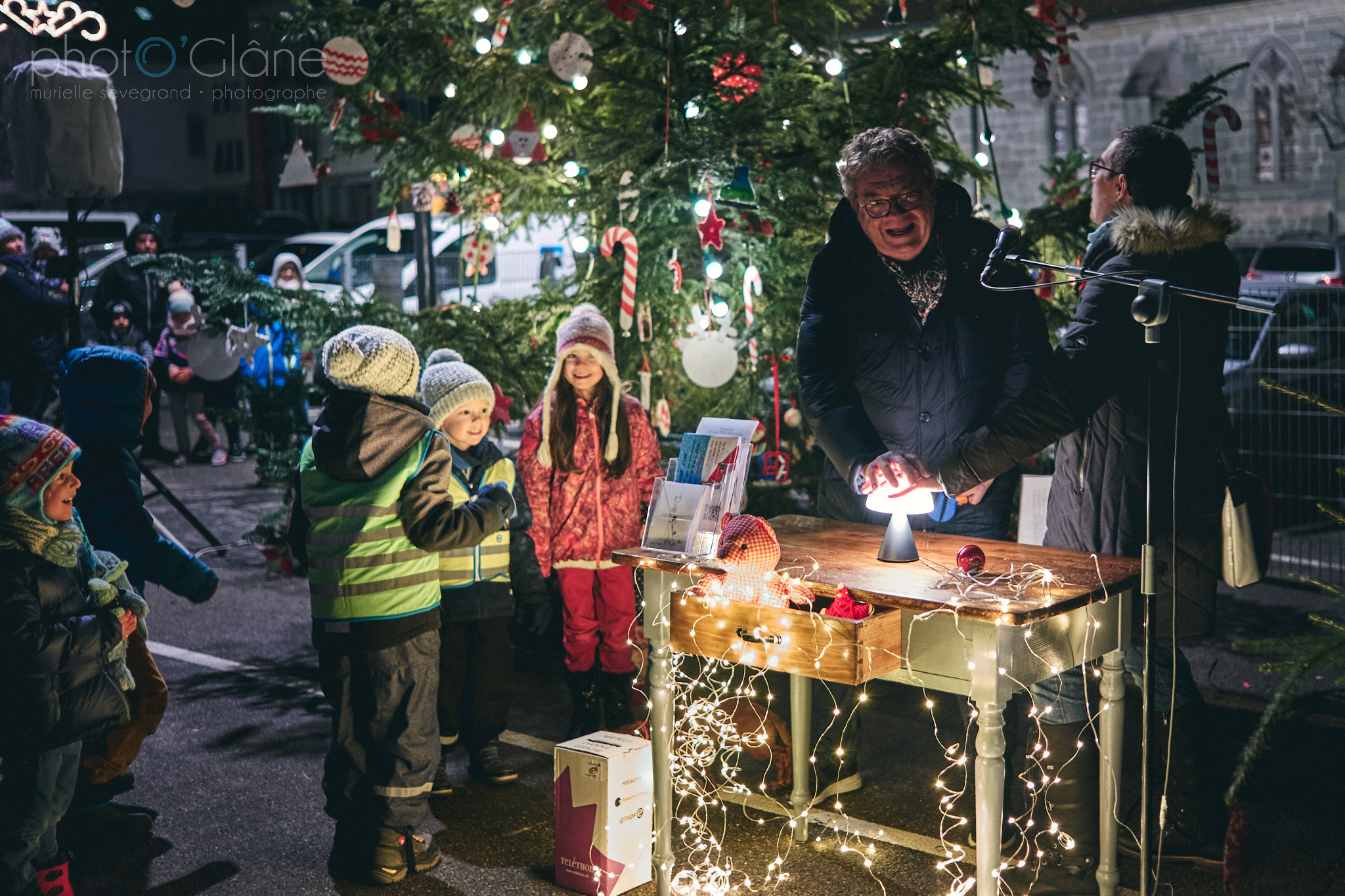 Illumination du sapin, décoré par les enfants de l'école primaire de Romont, à 18h45.