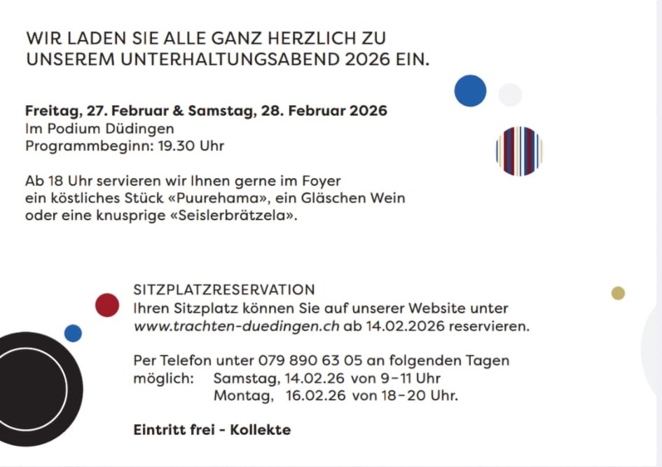 Sous le thème « Plan B », elle invite le groupe folklorique de Düdingen et le groupe de danse folklorique pour jeunes de la Singine à une soirée placée sous le signe du folklore au Podium Düdingen. Un programme varié composé de danse, de chant, de cor des Alpes et de lancer de drapeaux attend les invités lors des deux soirées.