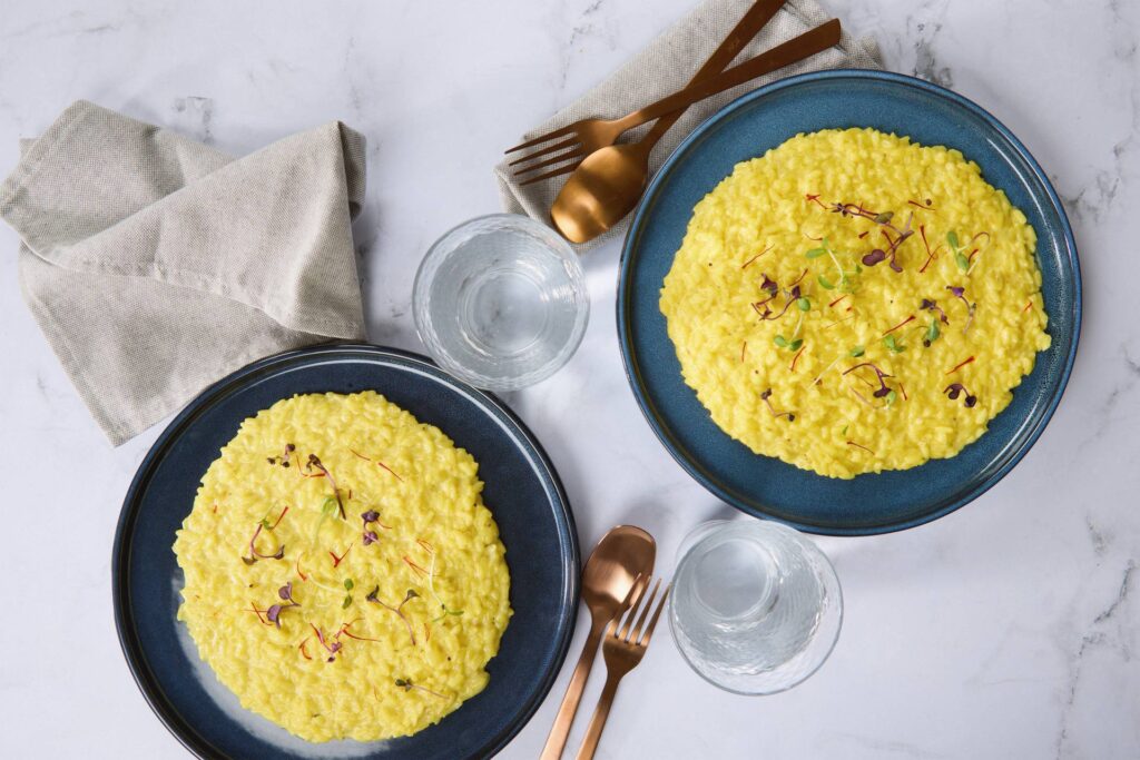 Un risotto se sert bien chaud dans une assiette plate. Traditionnellement, le risotto est aplati en tapant sous l’assiette. Cette technique permet au risotto de ne pas continuer à cuire trop longtemps dans l’assiette et évite qu’il devienne pâteux. Il se déguste en commençant par le bord qui refroidi plus rapidement.