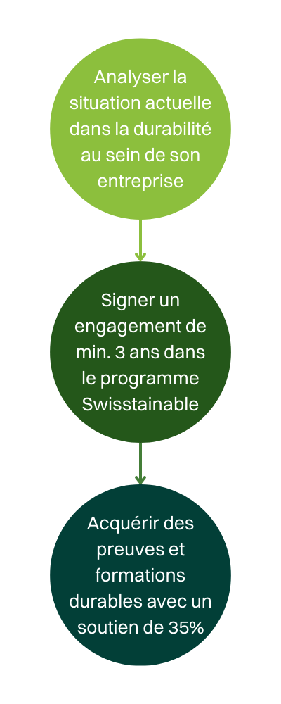 Les preuves et certifications servent d’outils et offrent une structure et une direction pour chaque entreprise. L’UFT soutient les labels et certifications reconnues ainsi que des formations proposées par des organismes compétents. Toutes bénéficient d’un soutien financier adapté de 35% du montant total. Pour se faire, le prestataire s’engage à participer au programme de durabilité suisse Swisstainable pour 3 années.